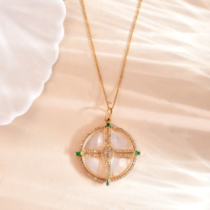 A luxurious 14K solid gold pendant featuring mother of pearl with natural diamond accents and a pearl medallion, offering an elegant and timeless design.