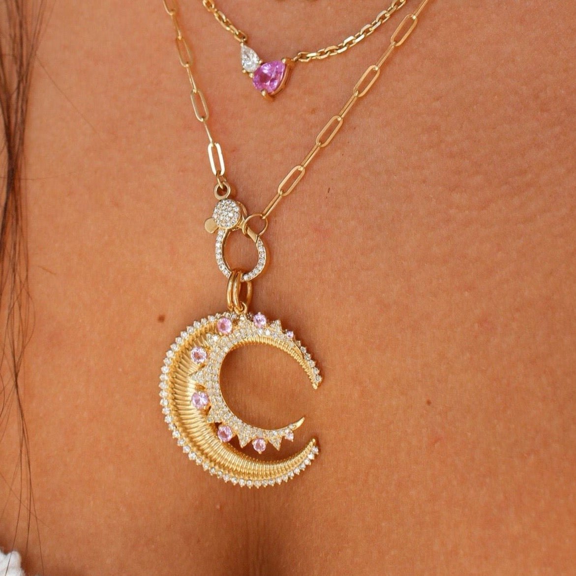 14K Solid Gold Diamond Pink Sapphire Crescent Moon Pendant