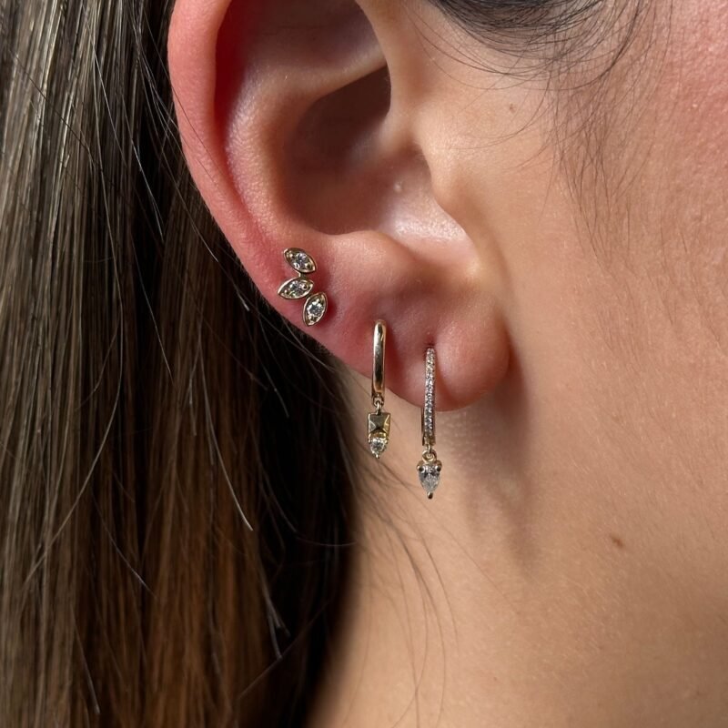 18k Solid Gold Moissanite Diamond Trio Bezel Curve Earring