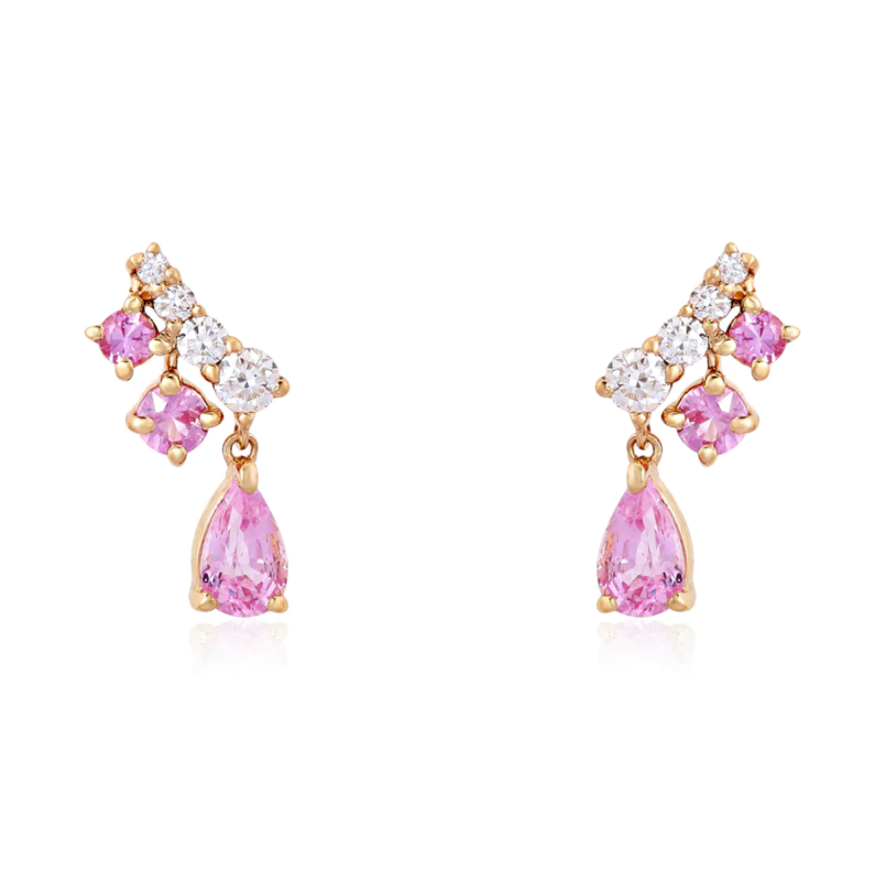 A sleek vertical bar of sparkle finished with a pear-shaped pink sapphire drop, crafted in 18K solid gold for modern, refined elegance.