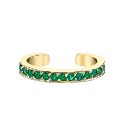 A chic 14K solid gold ear cuff featuring a single row of vibrant emeralds, offering a modern and elegant design perfect for any occasion.