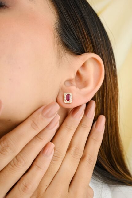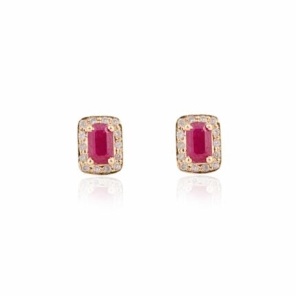 Elegant 14K solid gold ruby halo diamond stud earrings—featuring vibrant rubies surrounded by a sparkling diamond halo for timeless sophistication.