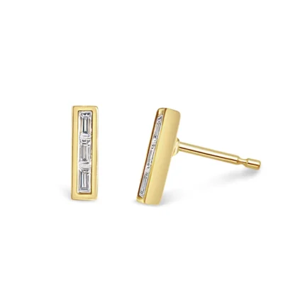 The Sloane Baguette Diamond Studs in 14K solid gold feature 6 baguette-cut diamonds (0.14 ct) and 28 brilliant-cut diamonds (0.15 ct). BIS Hallmarked, available in white, rose, and yellow gold, perfect for timeless elegance.