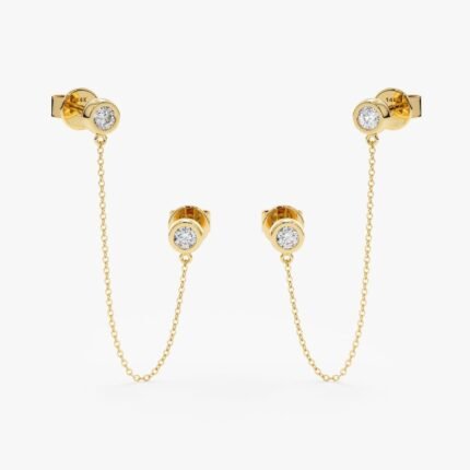Elevate your style with our Double Natural Diamond Hanging Chain Studs. Handmade from solid gold, each stud features a dazzling diamond in a bezel setting, connected by a delicate chain for a modern twist.