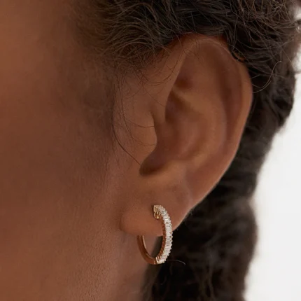 The Karat Store 14K Gold Natural Diamond Hoop Earrings for Women are designed with 38 baguette diamonds (2 x 1 mm each), totaling 0.48 carats per pair. Crafted in 14K solid gold and available in white, rose, or yellow gold, these earrings feature G color, VS clarity diamonds, and a secure prong setting.
