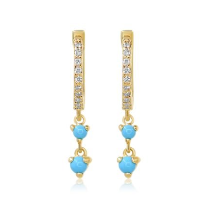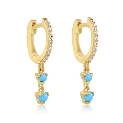 A stylish 14K solid gold hoop earring featuring two vibrant turquoise drops, offering a chic and colorful design perfect for any occasion.