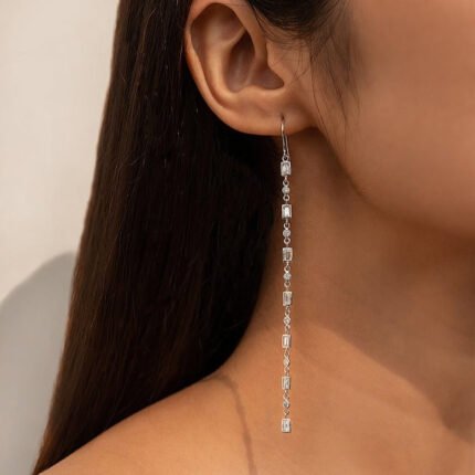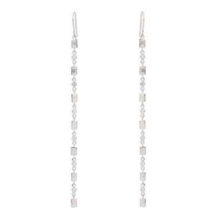 The 14K Gold Shoulder Baguette Natural Diamonds Duster Dangle Earrings feature 26 diamonds, including octagon and round shapes, totaling 2.27 carats. Set in 14K solid white gold with a bezel setting, these 3.22-gram earrings offer a chic and sophisticated duster design.