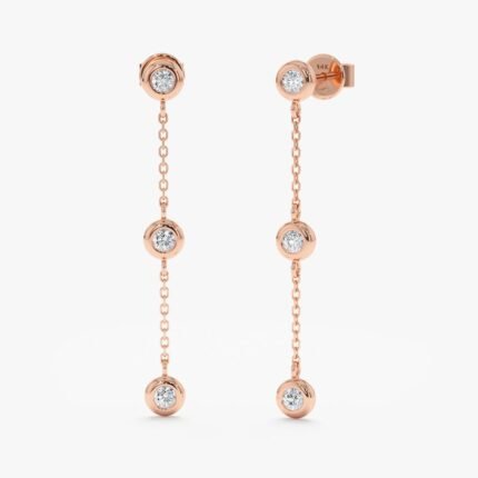 Elevate your ear stack with our Triple Diamond Hanging Earring Studs, crafted from solid gold and featuring three bezel-set natural diamonds suspended from delicate chains.