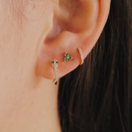 Delicate 14K solid gold stud earring featuring a trio of emeralds—crafted for minimalist charm, vibrant sparkle, and timeless everyday style.
