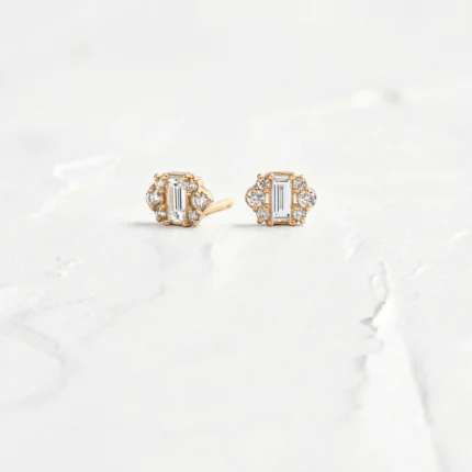 These elegant 14K Half Round Tapered Baguette Diamond Studs feature 14 Moissanite baguette diamonds (2.5 x 1.5 x 1.0 mm) and 2 additional round diamonds (2.0 mm). The studs are set in 14K solid gold (available in white, rose, and yellow gold), with a total diamond weight of 0.28 carats. The diamonds are D color and VVS1 clarity, ensuring exceptional brilliance. Certified BIS Hallmarked, these studs offer a perfect balance of modern elegance. Shipping takes 10-12 business days, and customer support is available via live chats and video calls.