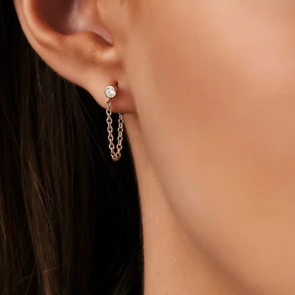 14K Solid Gold Bezel Setting Diamond Studs Chain Earrings