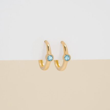 Elegant 14K solid gold aquamarine huggie earrings, combining the soothing blue of aquamarine with a timeless, versatile design for any occasion.