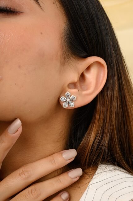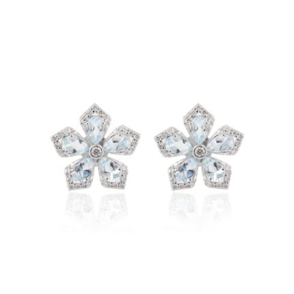 14K Solid Gold Aquamarine Flower Stud Earrings