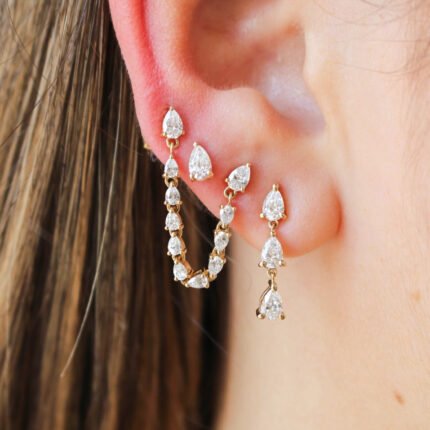 "Elegant 14K Gold Triple Mini Moissanite Diamond Drop Earring – a stunning design with three mini Moissanite diamonds in a drop setting, perfect for adding subtle sparkle and sophistication."
