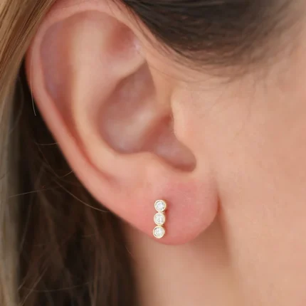"Elegant 14K Gold Moissanite Diamond Trio Bezel Curve Earring – a stunning design with three Moissanite diamonds set in bezels, perfect for adding a sophisticated, radiant touch."
