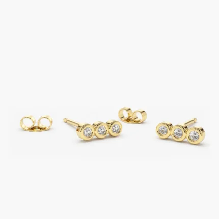 "Elegant 14K Gold 3 Stone Moissanite Diamond Bezel Earrings – a sophisticated design with three Moissanite diamonds set in bezels, perfect for a timeless, radiant style."