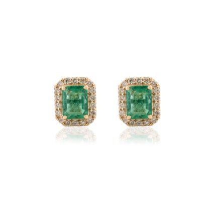 Elegant 14K solid gold diamond and emerald baguette studs, featuring a striking design with diamonds and emeralds for a chic, sophisticated look.