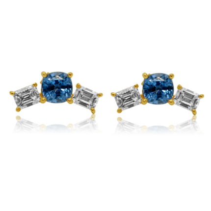 A stunning 14K solid gold climber earring featuring sparkling diamonds and vibrant blue sapphires, offering a modern and elegant design.