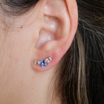 14K Solid Gold Diamond Blue Sapphire Climber Earring