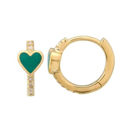 14K Solid Gold Diamond Green Enamel Heart Hoop Earring