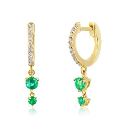 A stunning 14K solid gold hoop earring featuring diamond and emerald accents in a double drop design, offering a sophisticated and elegant touch.