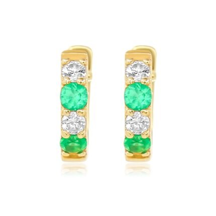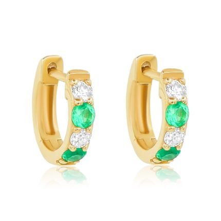Elegant 14K solid gold mini hoop earring featuring prong-set diamonds and emeralds—crafted for refined sparkle, rich color, and timeless charm.