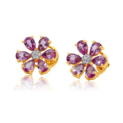 A delicate 14K solid gold earring featuring light pink sapphires surrounded by sparkling diamonds, designed in a beautiful flower shape.