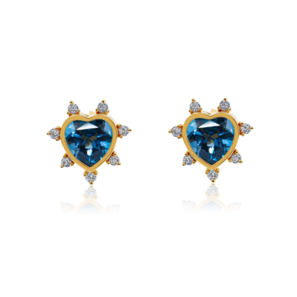 A bold 14K solid gold earring featuring diamond spikes and a London blue topaz heart, offering a striking and sophisticated design for any occasion.