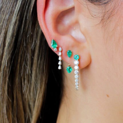 14K Solid Gold Diamond Pear Shaped Emerald Stud Earring