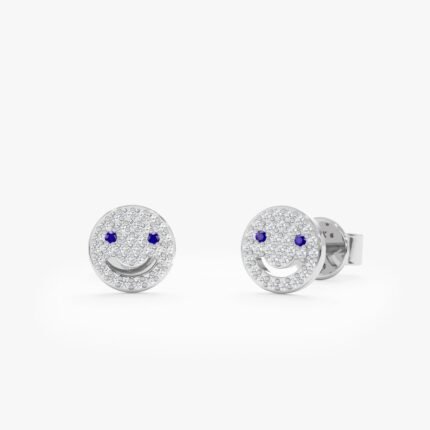 Natural Diamond Sapphire Happy Face Studs: Handmade solid gold smile emoji studs adorned with sparkling natural diamonds and sapphires, perfect for adding a fun touch to your ear party.