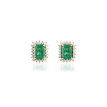 Timeless 14K gold stud earrings with vivid emerald centers surrounded by a halo of sparkling diamonds—perfect for elegant daily or evening wear.