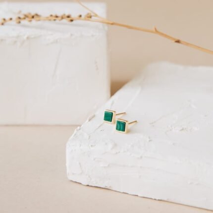 Elegant 14K solid gold minimalist malachite stud earrings, combining vibrant green and timeless design for a versatile and stylish accessory.