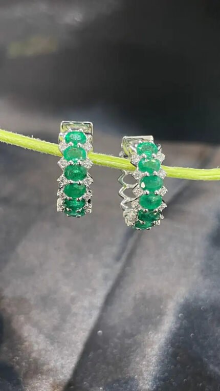 18k Solid Gold Emerald Diamond Designer Hoop Earrings