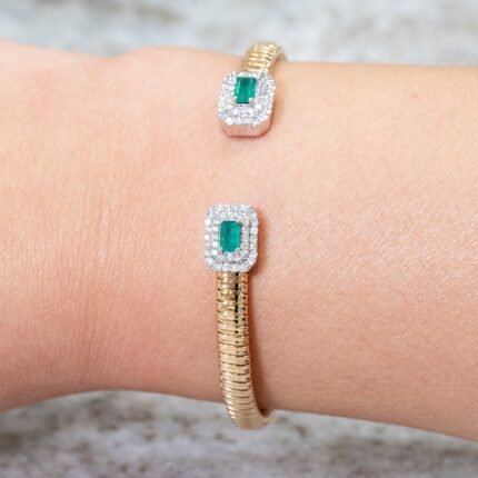 A stunning 14K solid gold flexible bangle featuring vibrant emeralds and sparkling diamonds, offering a luxurious and comfortable fit with an elegant design.