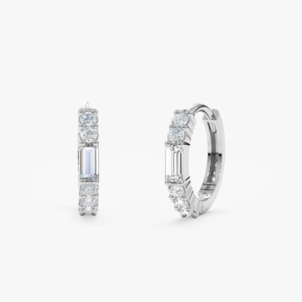 Elevate your style with Baguette Natural Diamond Huggies, featuring shimmering diamonds in a polished solid gold frame. Available in 14k yellow, rose, or white gold.