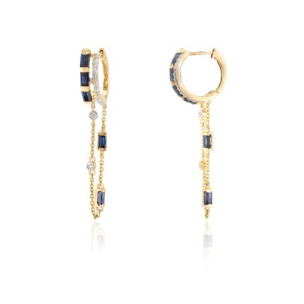 A stunning pair of 14K solid gold dangling chain earrings featuring blue sapphires and sparkling diamonds, offering an elegant and modern design perfect for any occasion.