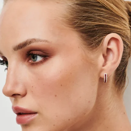 Elegant 14K solid gold hoop earrings featuring vivid rubies and round diamonds—crafted for classic charm, rich color, and radiant sparkle.