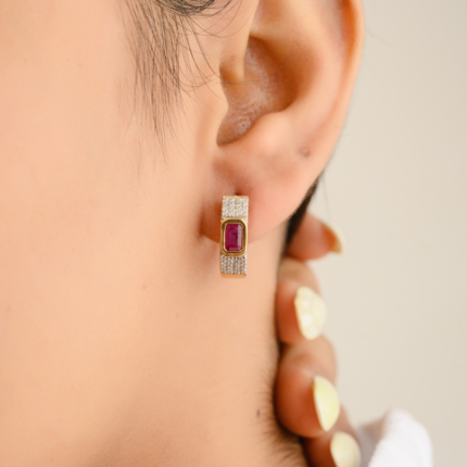Luxurious 14K solid gold hoop earrings adorned with vivid rubies and sparkling diamonds—crafted for timeless glamour and everyday elegance.