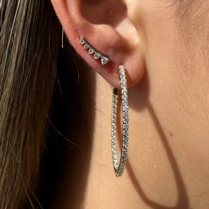 "Elegant 14K Gold Fine Line Football Shaped Moissanite Diamond Hoop Earring – a chic design with Moissanite diamonds set in a football-shaped hoop, perfect for a bold, sophisticated style."