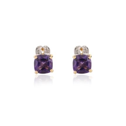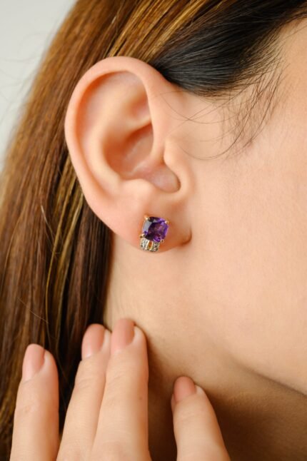 Elegant 14K solid gold stud earrings featuring vibrant amethyst stones, offering a timeless and sophisticated design perfect for any occasion.