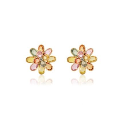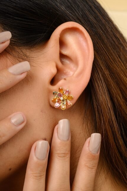 Delicate 14K solid gold floral stud earrings adorned with multi-colored sapphires, offering a vibrant and elegant touch for any occasion.