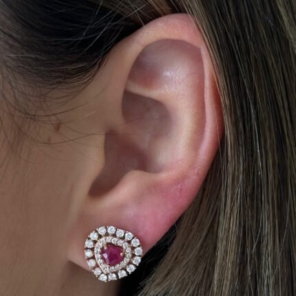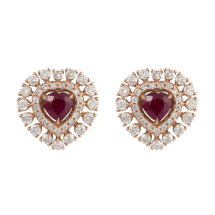 Elegant 14K solid gold earrings featuring heart-shaped rubies surrounded by sparkling diamonds, offering a romantic and timeless design.
