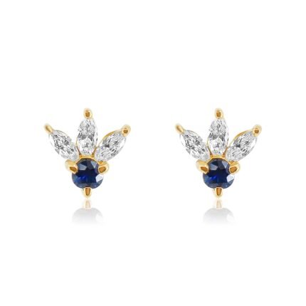 Graceful 14K solid gold stud earring in a lotus design featuring blue sapphires and diamonds—crafted for serene elegance and radiant sparkle.