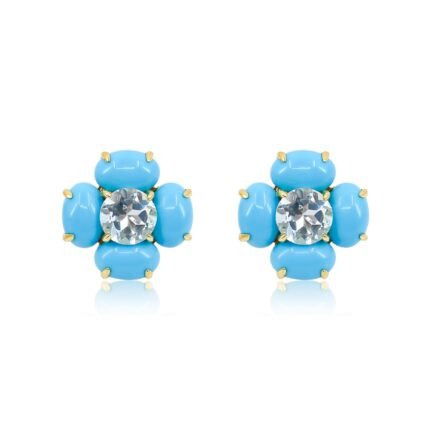 14K Solid Gold Topaz Turquoise Flower Stud Earring