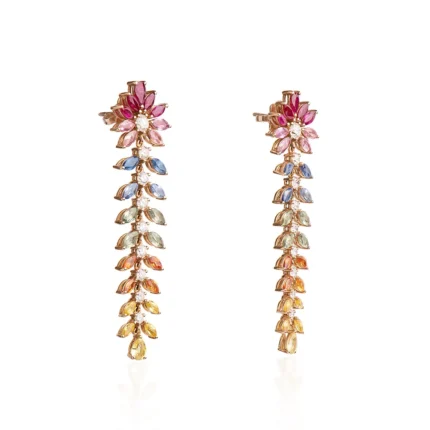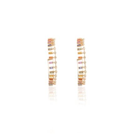 A bold pair of 18k solid gold hoop earrings featuring multi-sapphire stones and sparkling diamonds, offering a luxurious and colorful statement.