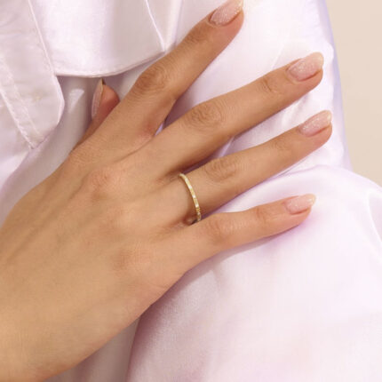 Slim 14k solid gold arrow wedding ring with 0.13 ct natural diamonds. Minimalist and stackable design in white, rose, and yellow gold. BIS Hallmarked & GIA certified.