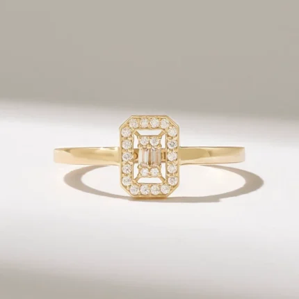 Elegant 14K gold baguette and pave diamond ring with 0.15 ct GH color, VS-SI clarity natural diamonds. BIS Hallmarked & GIA Certified.