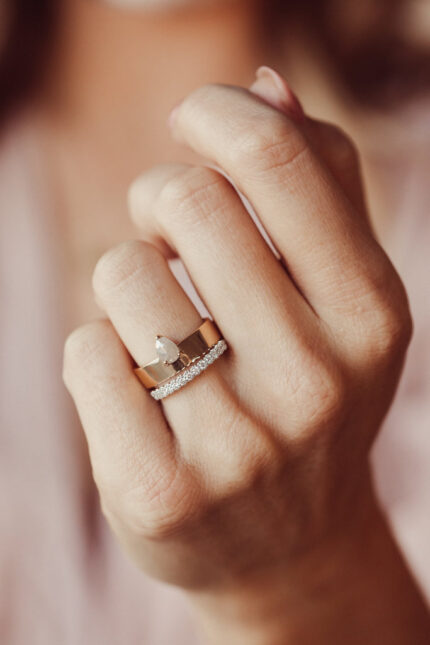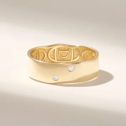 14K solid gold cigar band with two flush-set natural diamonds (GH color, VS-SI clarity, 0.02 ct). BIS Hallmarked & GIA certified.