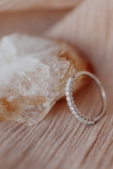 The 14K Gold Eternity Line Wedding Band features a ribbed dome design adorned with 0.07 ct natural diamonds. Available in white, rose, and yellow gold with BIS Hallmark.