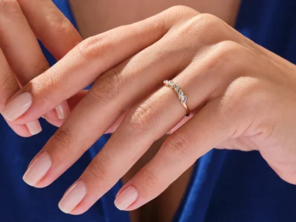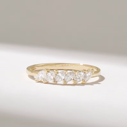 14k Gold Elegant Natural Diamond Marquise Wedding Ring, Slanted 6 Stone Stackable Band